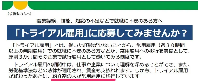 筆者の場合はトライアル雇用で雇われることなく終わってしまいましたが、厚生労働省によるとトライアル雇用が終わった後の約8割の人が常用雇用に移行しています。