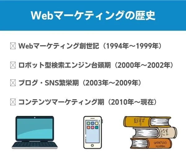 次は、Webマーケティングの歴史を見ていきましょう。Webマーケティングはまだ新しいジャンルですが、時代の変化とともに移り変わってきた様子をご紹介します。