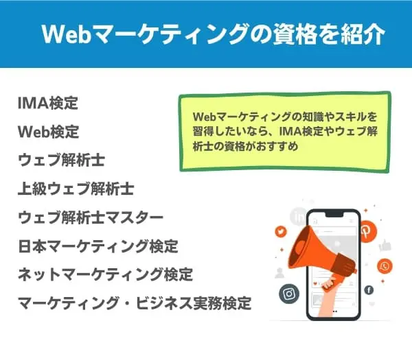 Webマーケティングの知識やスキルを習得したいなら、IMA検定ウェブ解析士の資格がおすすめです。マーケティング全般の知識を身に付けたいのであれば、日本マーケティング検定がおすすめとなります。