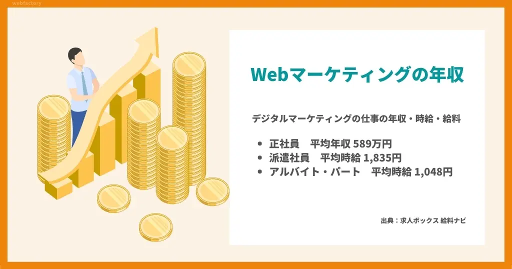 Webマーケティングには様々な業務があり、中小企業でSNSや広告運用などがメインの業務になるなら、高い収入は望めません。しかし、キャリアを積んで実績を積み上げれば、収入アップは期待できます。