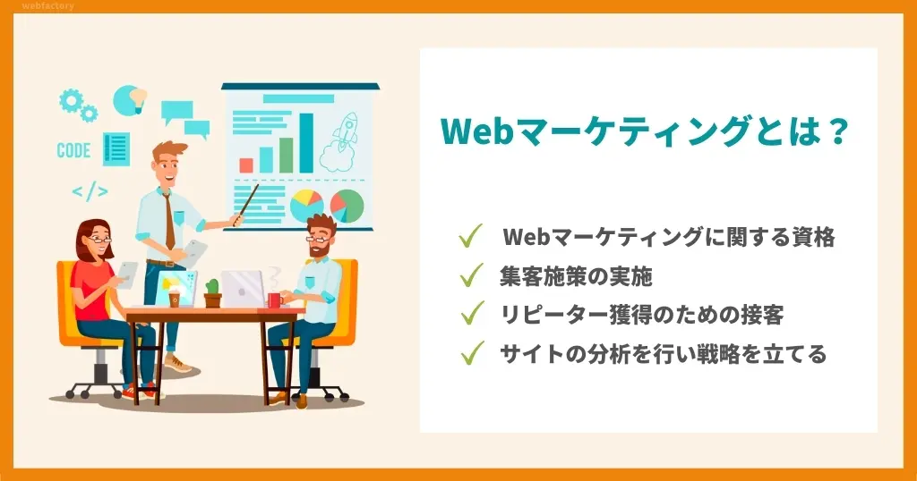 Webマーケティングは、サイトの収益を上げるために、集客を行ったりサイト分析を行う仕事です。Webマーケターになるためには、SEOの基礎的な知識や広告運用するための知識が必要になります。